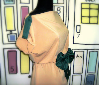 Rochie scurta din voal beije, stransa pe talie. Are aplicatii verde-smarald pe umeri si funda mare in talie.